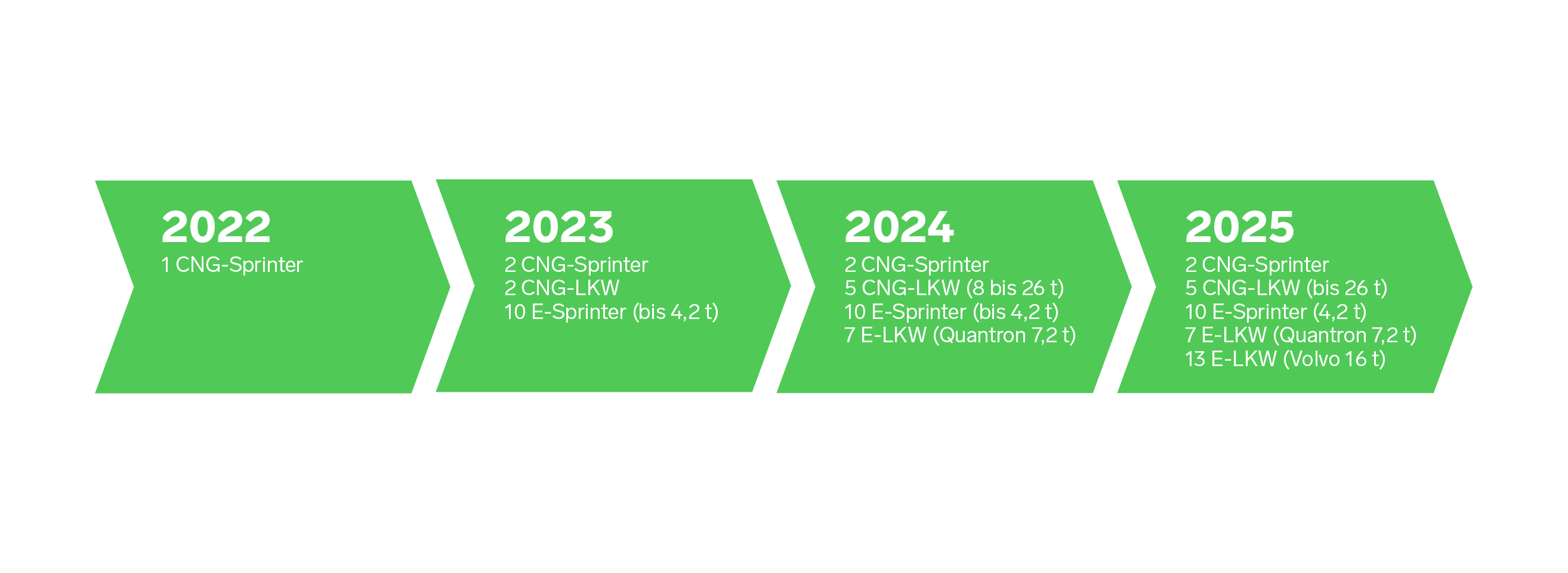 Wir setzen verstärkt auf alternative Antriebe, um unsere Fahrzeugflotte nachhaltiger zu gestalten. Anstelle von herkömmlichen Verbrennungsmotoren integrieren wir CNG- und Elektrofahrzeuge in unseren Fuhrpark. Der Einsatz von alternativen Antrieben hilft uns dabei, CO2e-Emissionen zu reduzieren und bietet darüber hinaus noch weitere Vorteile wie beispielsweise weniger Feinstaub, Stickoxide und einen geringeren Lärmpegel. So tragen wir – insbesondere in den Städten – zu sauberer Luft und einem besseren Lebensumfeld bei. Alle unsere CNG-Fahrzeuge werden aus Gründen des Klimaschutzes mit Biogas betrieben. Bio-CNG ist nahezu CO2-neutral, da beim Verbrennen des Gases nur so viel CO2 ausgestoßen wird, wie zuvor durch das Pflanzenwachstum gebunden worden ist. Darüber hinaus werden unsere Mitarbeitenden in Eco-Fahrtrainings über optimales Fahrverhalten unterrichtet, um die Umweltbelastung so gering wie möglich zu halten.